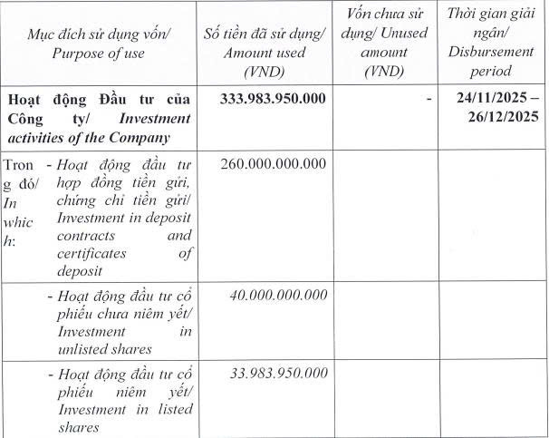 Doanh nghiệp đã sử dụng vốn thu được nêu trên cho các hoạt động đầu tư hợp đồng tiền gửi, chứng chỉ tiền gửi và cổ phiếu của công ty. Thời gian thực hiện giải ngân từ ngày 24/11/2025 đến ngày 26/12/2025.