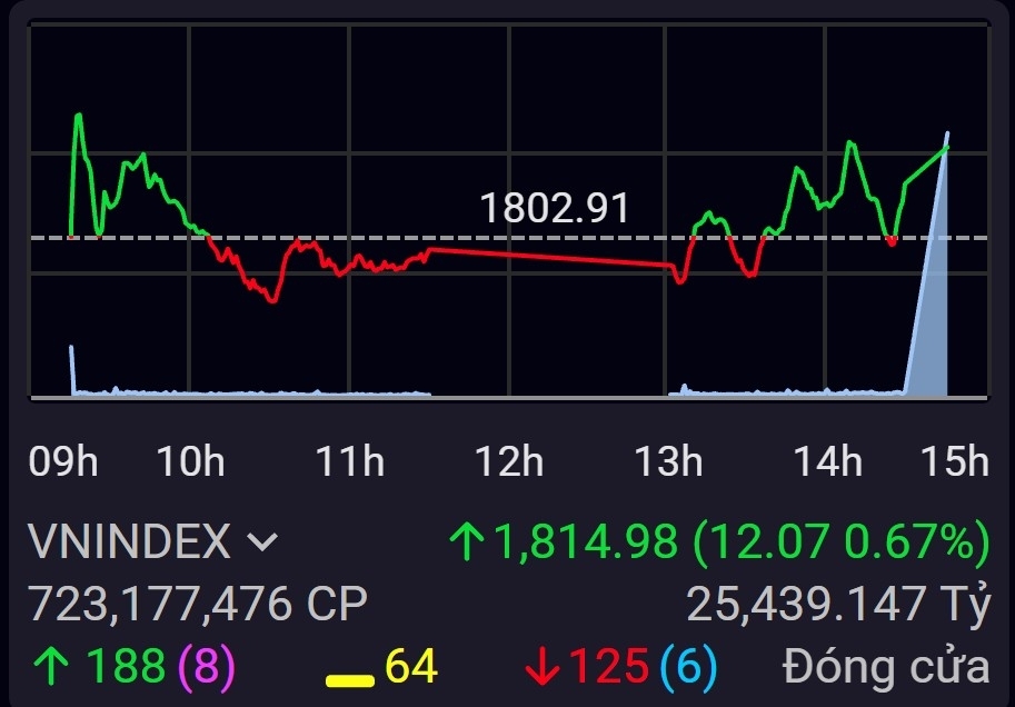VN-Index bật tăng 12 điểm sau khi giữ vững vùng 1.800