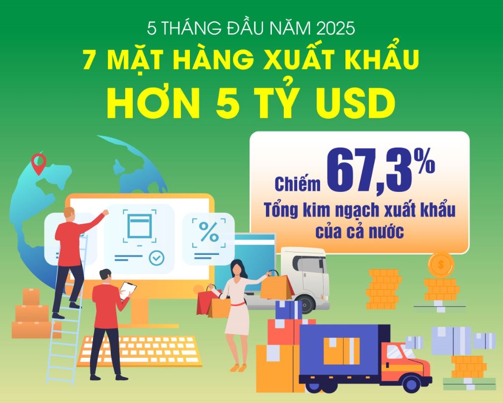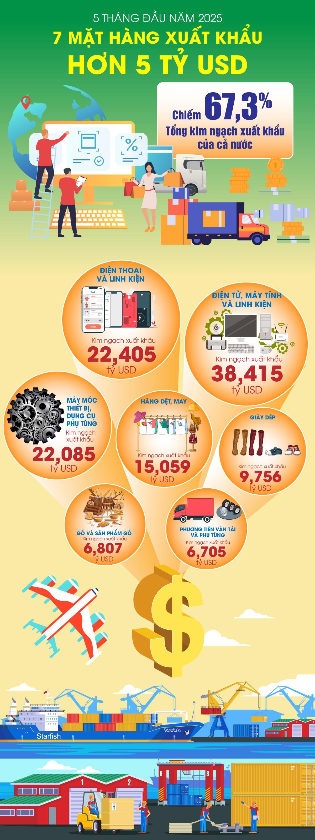 Trong 5 tháng đầu năm 2025, có 7 mặt hàng xuất khẩu trên 5 tỷ USD, chiếm 67,3% tổng kim ngạch xuất khẩu.
