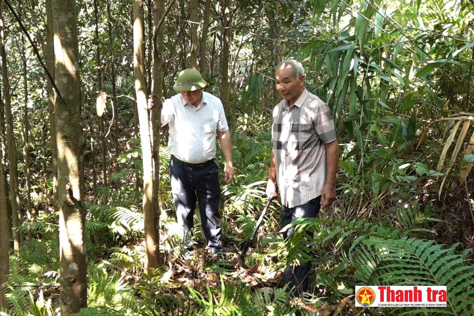 Ông Đàm Quang Thành, Trưởng phòng Kinh tế xã Ba Chẽ, cùng người dân kiểm tra sinh trưởng của cây quế trong rừng sản xuất tại xã Ba Chẽ. Ảnh: Hà Thành