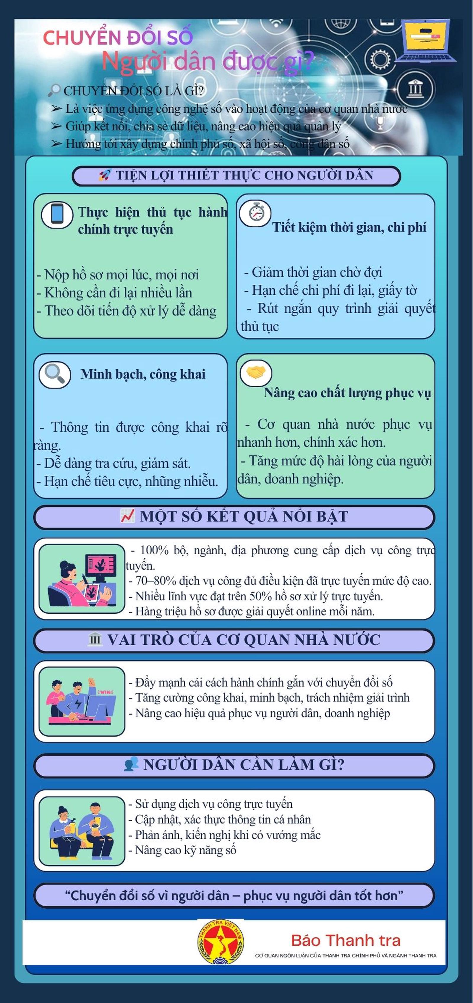 Chuyển đổi số đang tạo ra những thay đổi rõ nét trong đời sống, từ giải quyết thủ tục hành chính trực tuyến, tiết kiệm thời gian, chi phí đến nâng cao tính công khai, minh bạch và chất lượng phục vụ. Không chỉ là xu hướng tất yếu, chuyển đổi số còn đang góp phần xây dựng nền hành chính hiện đại, phục vụ người dân và doanh nghiệp ngày càng hiệu quả hơn.
