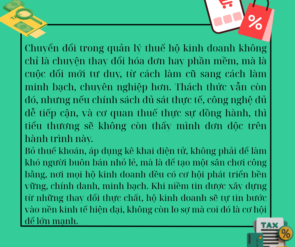 Chuyển đổi phương thức quản lý thuế từ khoán sang kê khai điện tử là bước đi tất yếu để hiện đại hóa nền kinh tế. Nhưng vấn đề đặt ra hiện nay là làm thế nào để chính sách thuế mới không trở thành gánh nặng, mà thực sự là động lực hỗ trợ hộ kinh doanh phát triển minh bạch, bền vững?