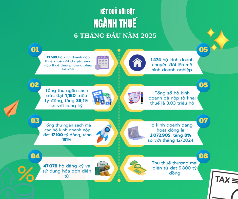 Theo ông Mai Xuân Thành, Cục trưởng Cục Thuế (Bộ Tài chính) thực hiện Nghị quyết 68-NQ/TW, trong 6 tháng qua, đã có 13.699 hộ kinh doanh chuyển sang kê khai thuế theo đúng quy định. Riêng 6 tháng đầu năm 2025, có 1.474 hộ kinh doanh truyền thống chuyển đổi thành doanh nghiệp, trong đó riêng tháng 6 đã có 910 hộ, chiếm gần 2/3 tổng số hộ chuyển đổi.