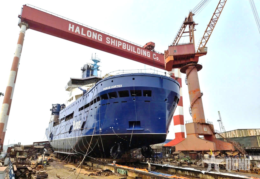 Tàu dịch vụ điện gió CSOV-9020 được đóng mới tại Công ty TNHH MTV Đóng tàu Hạ Long. Ảnh: BẢO LINH