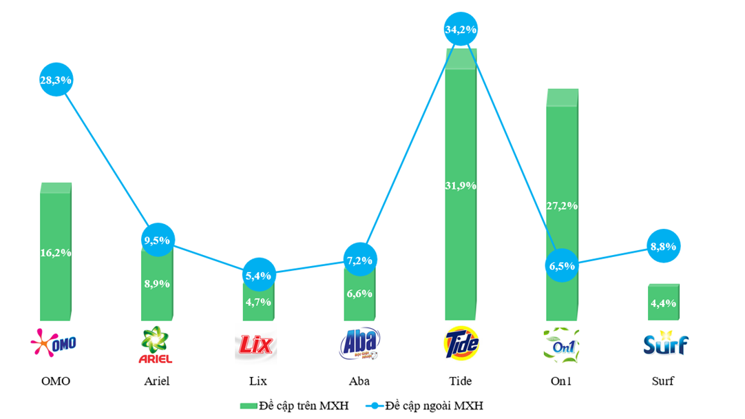 Trong khi đó, các thương hiệu khác như ArielOn1SurfAba và Lix có tỷ lệ đề cập dao động từ 5% đến 9%, phản ánh mức độ cạnh tranh tương đối cân bằng ở nhóm giữa. Đáng chú ý, On1 và Surf – hai thương hiệu nội địa – đang từng bước mở rộng mức độ nhận biết nhờ sự đầu tư hơn vào các chiến dịch truyền thông quy mô lớn, hướng đến nhóm khách hàng trẻ.