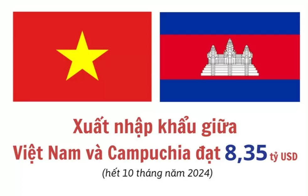 Theo Tổng cục Hải quan, hết tháng 10 năm 2024 tổng kim ngạch xuất nhập khẩu giữa Việt Nam và Campuchia đạt 8,35 tỷ USD.