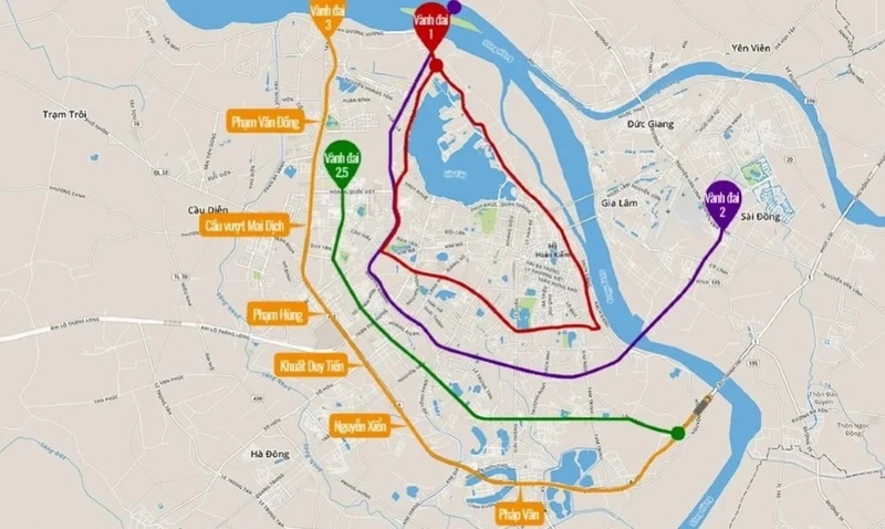Bản đồ các đường vành đai tại Hà Nội. Ảnh: Bộ Xây dựng