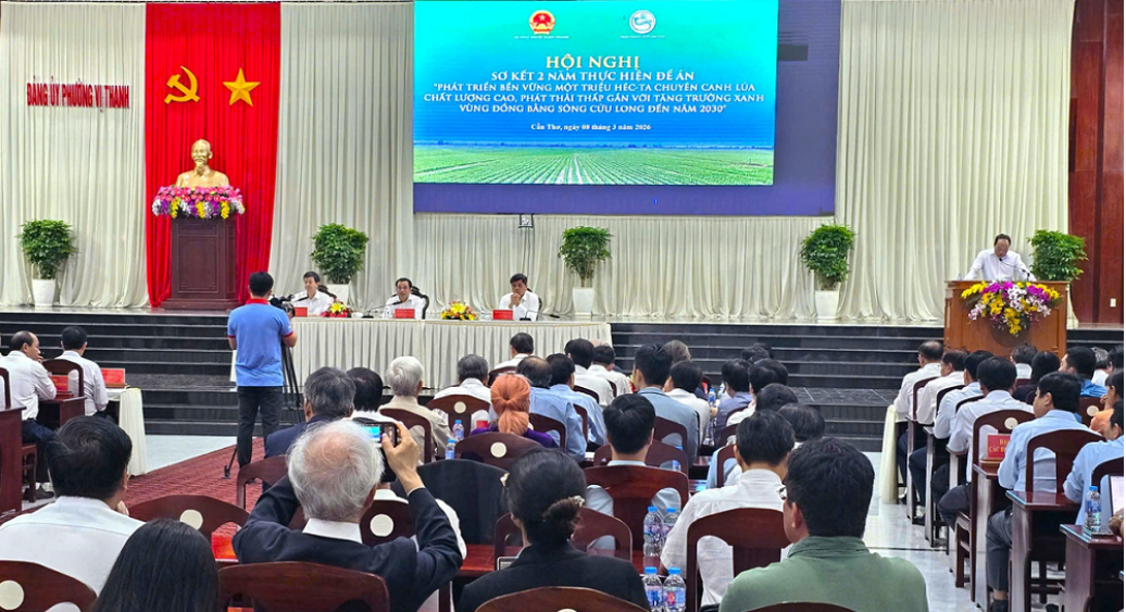 Ngày 8/3, tại phường Vị Thanh (thành phố Cần Thơ), Bộ Nông nghiệp và Môi trường tổ chức Hội nghị sơ kết 2 năm thực hiện Đề án phát triển bền vững 1 triệu ha lúa chất lượng cao, phát thải thấp gắn với tăng trưởng xanh khu vực đồng bằng sông Cửu Long đến năm 2030.