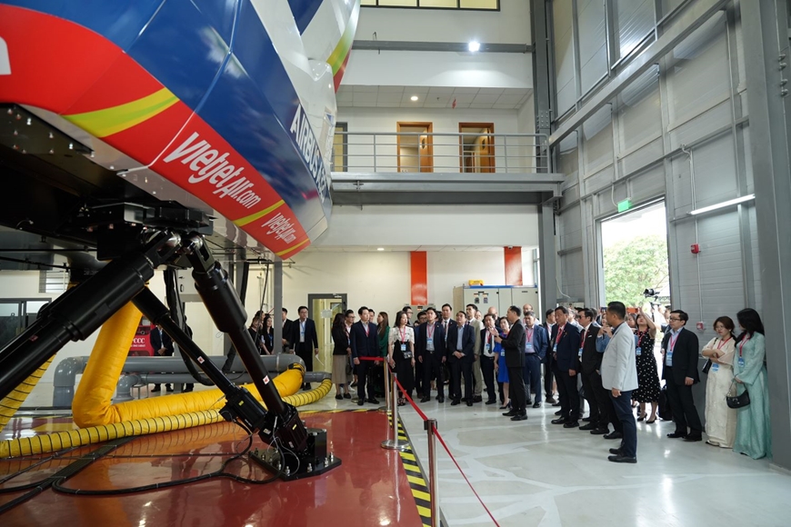 Các đại biểu kiều bào tiêu biểu tham quan buồng lái mô phỏng tàu bay Airbus A320 tại Học viện Hàng không Vietjet. |