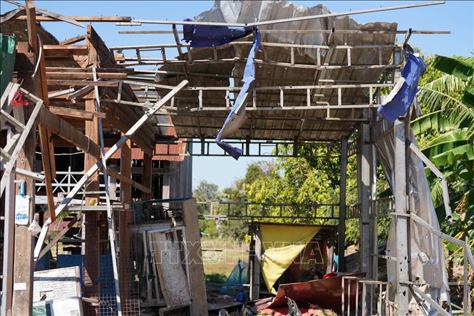 Nhà dân ở tỉnh Oddar Meanchey (Campuchia) bị phá hủy trong xung đột biên giới giữa Thái Lan và Campuchia, ngày 20-12-2025. Ảnh: THX/TTXVN
