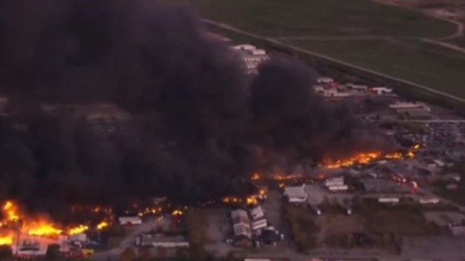 | Hiện trường vụ rơi máy bay của UPS ngày 4-11 (giờ địa phương) gần sân bay quốc tế Louisville Muhammad Ali, bang Kentucky, Mỹ. Ảnh: RT/X |