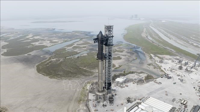 | Tên lửa Starship được đặt trên bệ phóng tại Texas, Mỹ. Ảnh tư liệu: THX/TTXVN |
