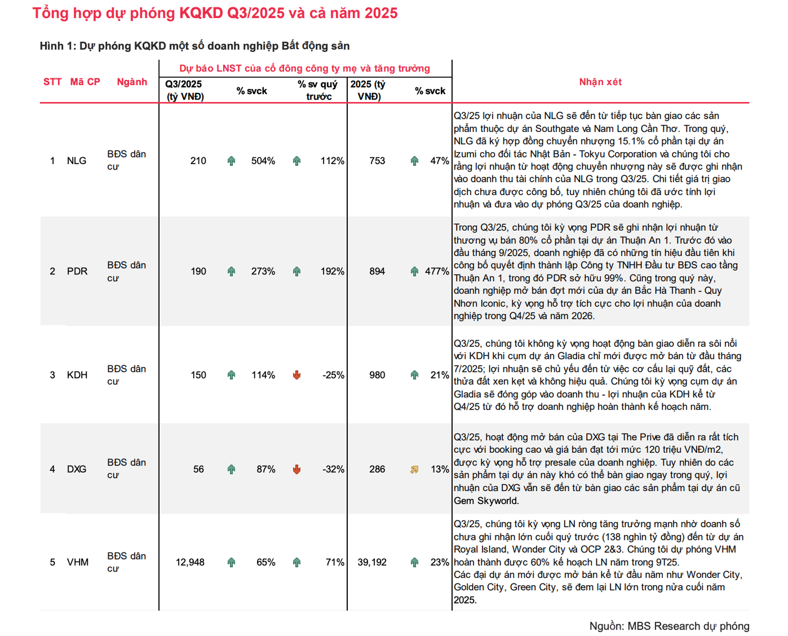 MBS cho rằng lợi nhuận của các doanh nghiệp bất động sản niêm yết theo dõi trong quý 3/2025 ghi nhận tăng trưởng 68,7% so với cùng kỳ. Nguồn: MBS.