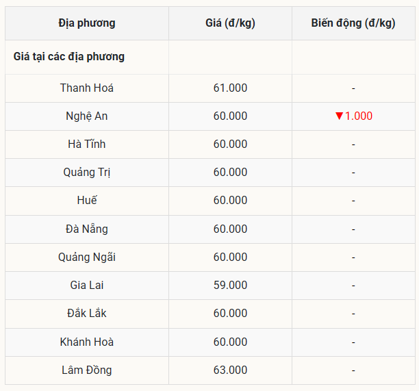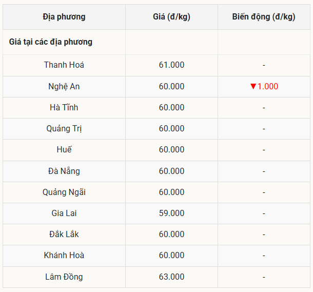 Ở Hải Phòng là địa phương duy nhất có sự điều chỉnh giảm, niêm yết mức 61.000 đồng/kg. Trong khi đó, các tỉnh thành còn lại giữ vững mức giá ổn định so với ngày trước đó.