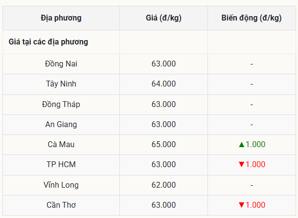Cả TP. Hồ Chí Minh và Cần Thơ đều đồng loạt giảm 1.000 đồng/kg, đưa mức giá tại hai thành phố này xuống còn 63.000 đồng/kg.