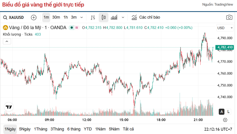 Theo Kitco, giá vàng thế giới ghi nhận lúc 4h30 hôm nay theo giờ Việt Nam giao ngay ở mức 4,782.4 USD/ounce. Giá vàng hôm nay giảm 0,25% so với hôm qua. Quy đổi theo tỷ giá USD trên thị trường tự do (26.700 VND/USD), vàng thế giới có giá khoảng 154 triệu đồng/lượng (chưa tính thuế, phí). Như vậy, giá vàng miếng SJC đang cao hơn giá vàng quốc tế khoảng 18,7 triệu đồng/lượng.