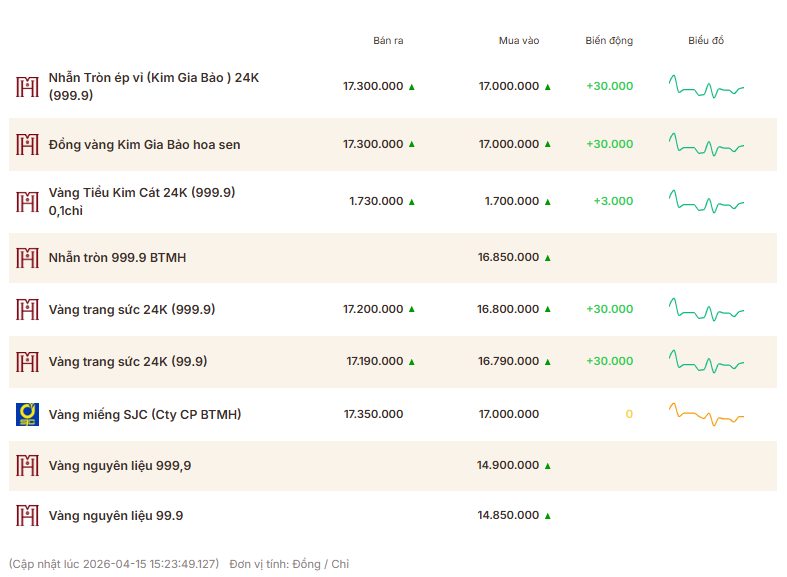 | Vàng nhẫn | Rạng sáng 15/4 | Rạng sáng 16/4 | Chênh lệch | |||