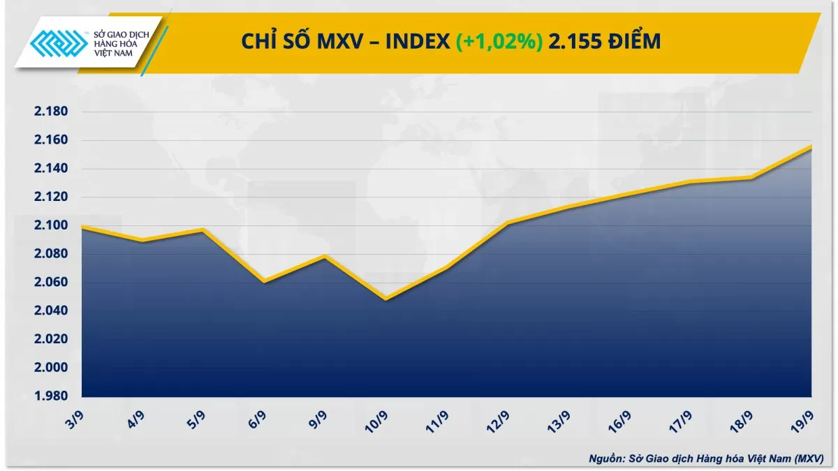 Sở Giao dịch hàng hóa Việt Nam cho biết lực mua tiếp tục chiếm ưu thế đã hỗ trợ chỉ số MXV-Index tăng 1,02% lên mức 2.155 điểm, nối dài chuỗi tăng sang phiên 7.