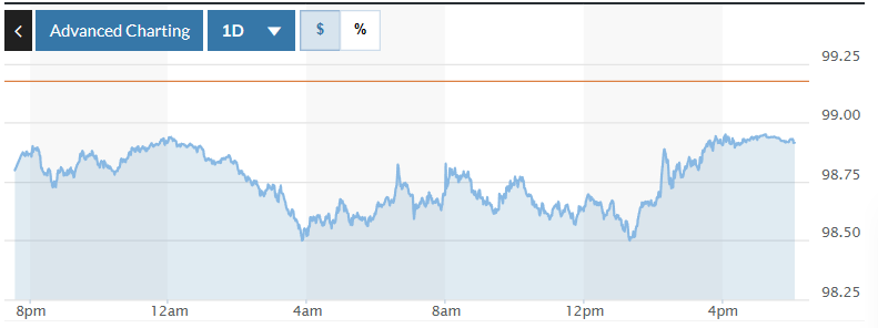 Trên thị trường Mỹ, chỉ số US Dollar Index (DXY) đo lường biến động đồng bạc xanh với 6 đồng tiền chủ chốt (EUR, JPY, GBP, CAD, SEK, CHF) hiện ở mức 98,91.