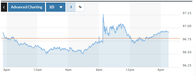 Biểu đồ biến động Chỉ số DXY trong 24 giờ qua. Ảnh: Market watch