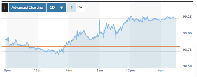 | Biểu đồ biến động Chỉ số DXY trong 24 giờ qua. Ảnh: Market watch |