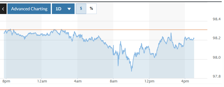 Trên thị trường Mỹ, chỉ số US Dollar Index (DXY) đo lường biến động đồng bạc xanh với 6 đồng tiền chủ chốt (EUR, JPY, GBP, CAD, SEK, CHF) giảm 0,09%, hiện ở mức 98,22.