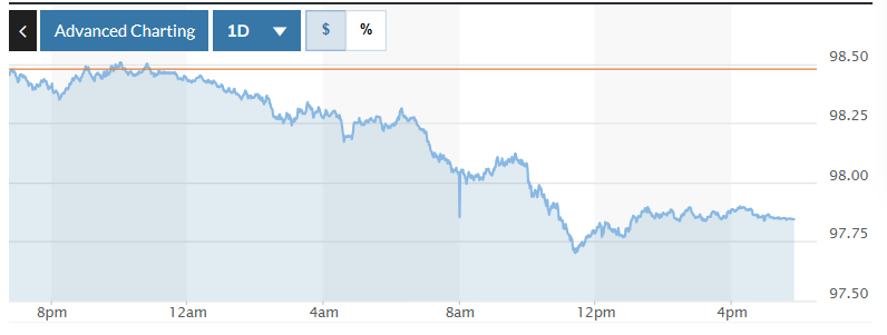 | Biểu đồ biến động Chỉ số DXY trong 24 giờ qua. Ảnh: Marketwatch |