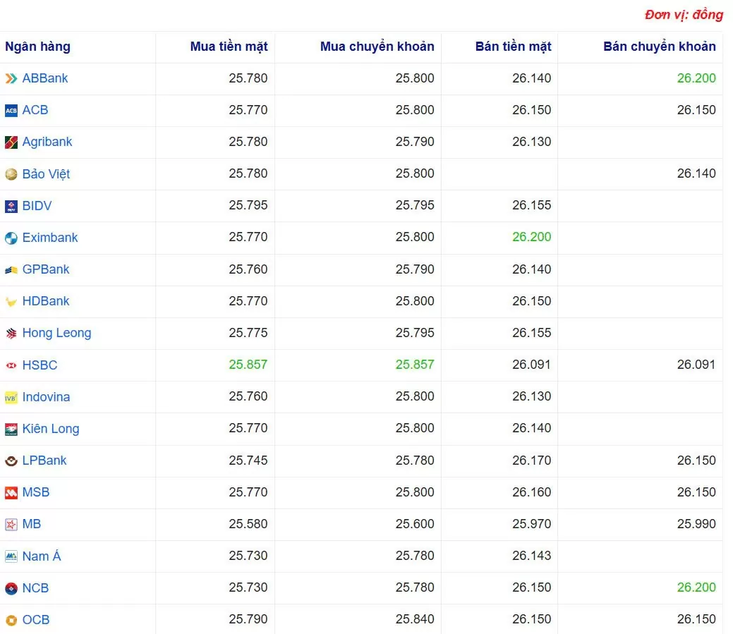 Ngân hàng HSBC đang mua chuyển khoản USD với giá cao nhất là: 1 USD = 25.857 VND