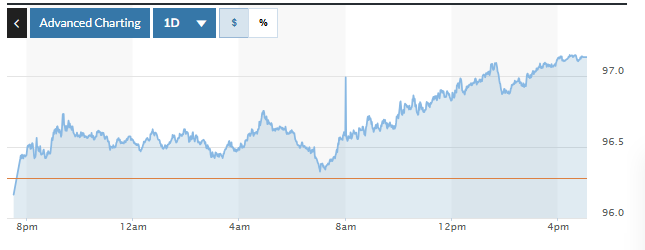 | Biểu đồ biến động Chỉ số DXY trong 24 giờ qua. Ảnh: Market watch |