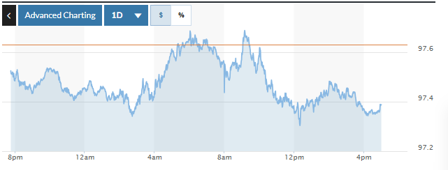 | Biểu đồ biến động Chỉ số DXY trong 24 giờ qua. Ảnh: Market watch |