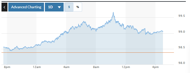 Biểu đồ biến động Chỉ số DXY trong 24 giờ qua. Ảnh: Market watch