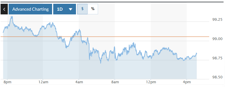 Biểu đồ biến động Chỉ số DXY trong 24 giờ qua. Ảnh: Market watch |
