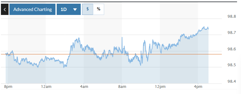 Trên thị trường Mỹ, chỉ số US Dollar Index (DXY) đo lường biến động đồng bạc xanh với 6 đồng tiền chủ chốt (EUR, JPY, GBP, CAD, SEK, CHF) tăng 0,16%, hiện ở mức 98,73.