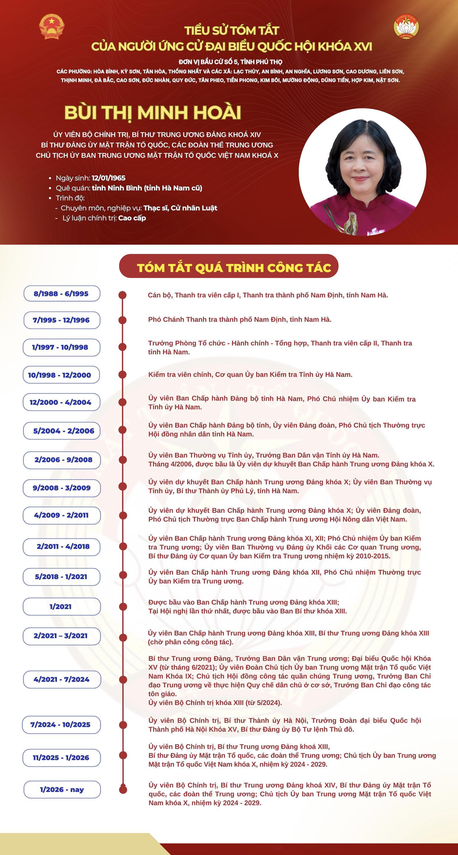 Bà Bùi Thị Minh Hoài, Ủy viên Bộ Chính trị, Bí thư Trung ương Đảng, Bí thư Đảng ủy Mặt trận Tổ quốc, các đoàn thể Trung ương, Chủ tịch Ủy ban Trung ương Mặt trận Tổ quốc Việt Nam ứng cử đại biểu Quốc hội khóa XVI tại đơn vị bầu cử số 5, tỉnh Phú Thọ gồm các phường: Hòa Bình, Kỳ Sơn, Tân Hòa, Thống Nhất và các xã: Lạc Thủy, An Bình, An Nghĩa, Lương Sơn, Cao Dương, Liên Sơn, Thịnh Minh, Đà Bắc, Cao Sơn, Đức Nhàn, Quy Đức, Tân Pheo, Tiền Phong, Kim Bôi, Mường Động, Dũng Tiến, Hợp Kim, Nật Sơn.