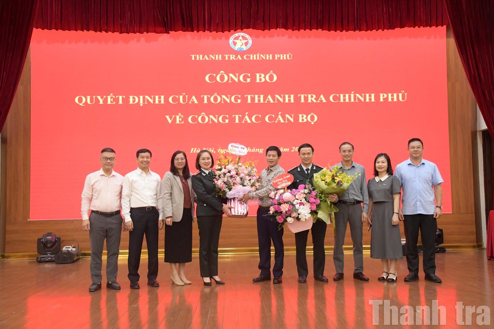 Phó Tổng Thanh tra Chính phủ Dương Quốc Huy trao quyết định và tặng hoa chúc mừng tân Vụ trưởng và Phó Vụ trưởng Vụ Tổ chức cán bộ. Ảnh: HT