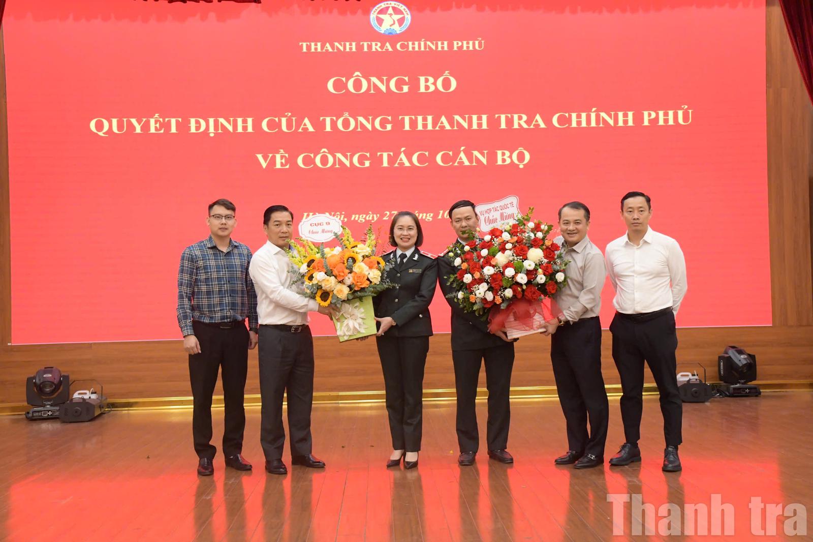 Phó Bí thư chuyên trách Đảng ủy Thanh tra Chính phủ Nguyễn Hữu Hòa cùng lãnh đạo Vụ Tổ chức cán bộ tặng hoa chúc mừng tân Vụ trưởng và tân Phó Vụ trưởng Vụ Tổ chức cán bộ. Ảnh: HT