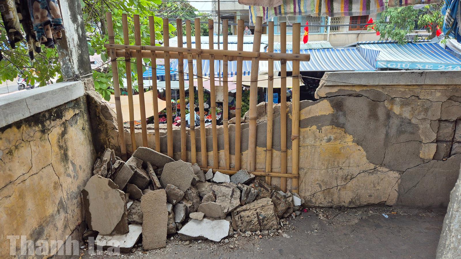 Khu vực hành lang tầng 1 lô B bị hư hỏng nặng, người dân dựng rào bằng tre ngăn nguy hiểm. Ảnh: Cảnh Nhật