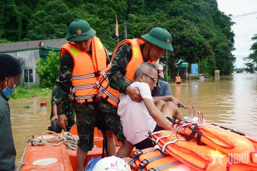 | Ban Chỉ huy Phòng thủ khu vực 5 - Anh Sơn (Bộ CHQS tỉnh Nghệ An) huy động phương tiện chuyên chở người dân trong các trường hợp khẩn cấp qua khu vực ngập lụt cuối tháng 7-2025. |