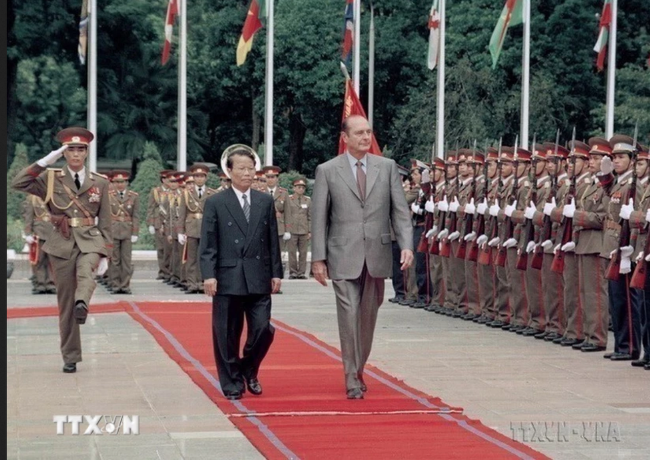 Chủ tịch nước Trần Đức Lương chủ trì Lễ đón Tổng thống Pháp Jacques Chirac thăm chính thức Việt Nam và dự Hội nghị Cấp cao Diễn đàn Á-Âu lần thứ 5 (ASEM 5), từ ngày 6 - 8/10/2004. Ảnh: Nguyễn Khang/TTXVN