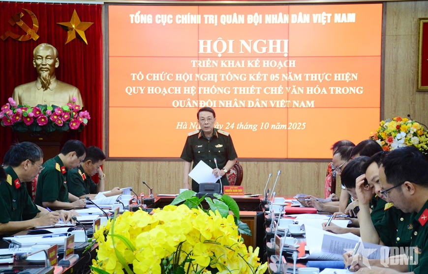 Ngày 24-10, tại Hà Nội, Tổng cục Chính trị Quân đội nhân dân (QĐND) Việt Nam tổ chức hội nghị triển khai kế hoạch tổ chức Hội nghị tổng kết 5 năm thực hiện Quy hoạch hệ thống thiết chế văn hóa (TCVH) trong QĐND Việt Nam. Thiếu tướng Nguyễn Xuân Thủy, Phó cục trưởng Cục Tuyên huấn, Tổng cục Chính trị QĐND Việt Nam, Phó trưởng ban Thường trực Ban tổ chức, chủ trì hội nghị.