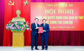 Ngày 3/1, thay mặt Ban Tổ chức Trung ương, Vụ trưởng Vụ địa phương I, Ban Tổ chức Trung ương Nguyễn Văn Tùng đã công bố Quyết định số 1789-QĐNS/TW, ngày 31/12/2024 của Ban Bí thư Trung ương Đảng về việc chuẩn y đồng chí Lê Hồng Vinh, Ủy viên Ban Thường vụ Tỉnh ủy, Phó Chủ tịch Thường trực UBND tỉnh giữ chức Phó Bí thư Tỉnh ủy Nghệ An, nhiệm kỳ 2020 - 2025.