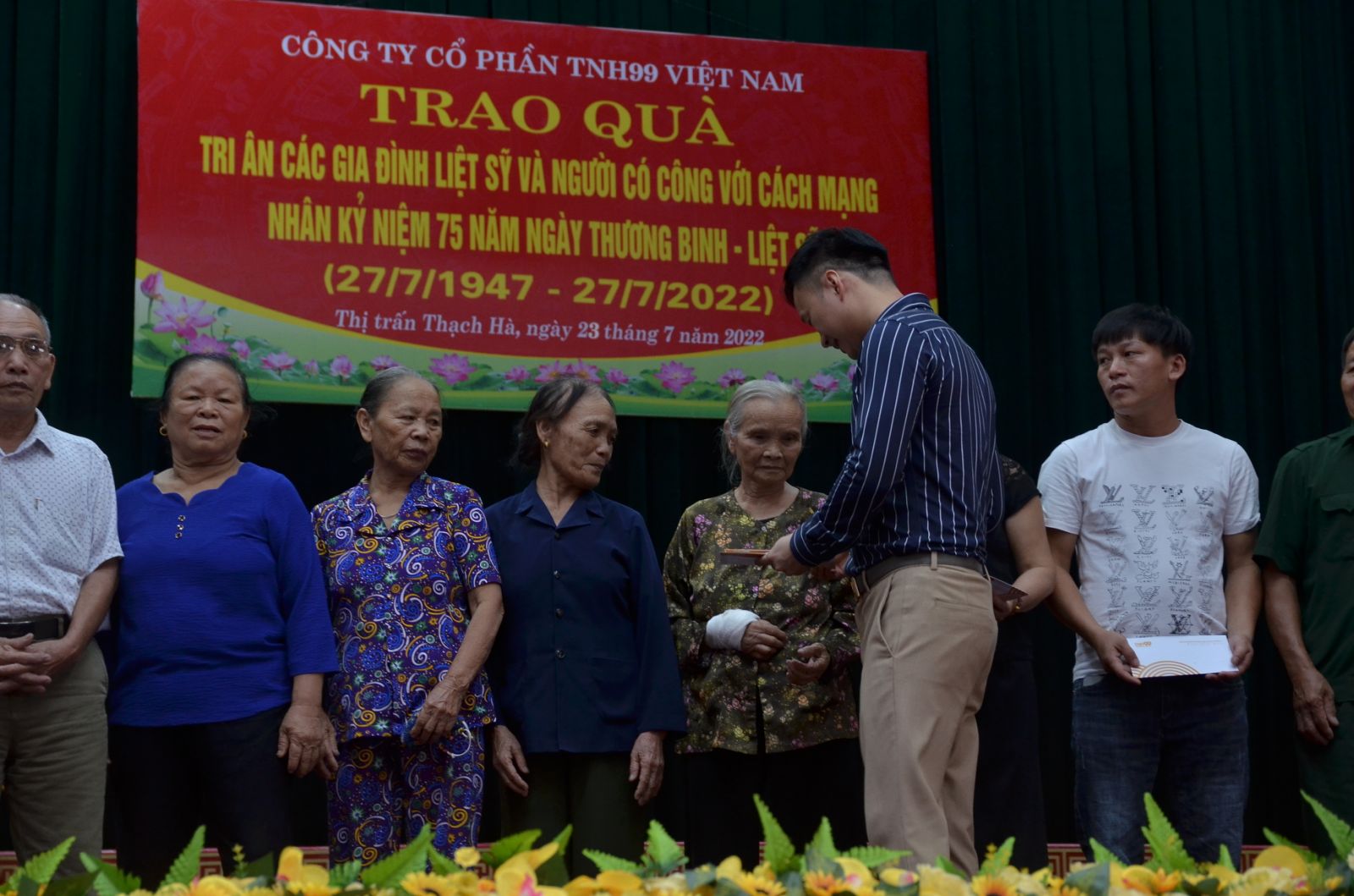 Tiếp nối chuỗi hoạt động của Công ty tại Hà Tĩnh, sáng ngày 23/7, Công ty Cổ phần TNH99 Việt Nam đã đồng hành cùng UBND trị trấn Thạch Hà tổ chức buổi gặp mặt trao quà cho người có công và thân nhân người có công với Cách mạng cùng Hội viên Hội cựu chiến binh có hoàn cảnh khó khăn trên địa bàn. Cụ thể, Công ty đã trao tặng 597 suất quà với tổng trị giá là 298.500.000 đồng.