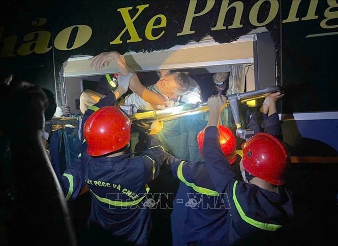Sau khi trinh sát, phát hiện nhiều người bị mắc kẹt trên xe khách, Chỉ huy cứu nạn, cứu hộ đã chỉ đạo phá cửa kính, tổ chức đưa 11 nạn nhân ra ngoài an toàn, đồng thời triển khai các mũi phun nước phòng ngừa cháy nổ do lượng nhiên liệu rò rỉ trên mặt đường.