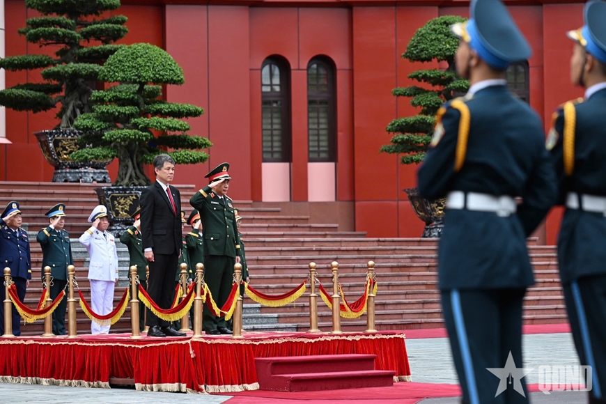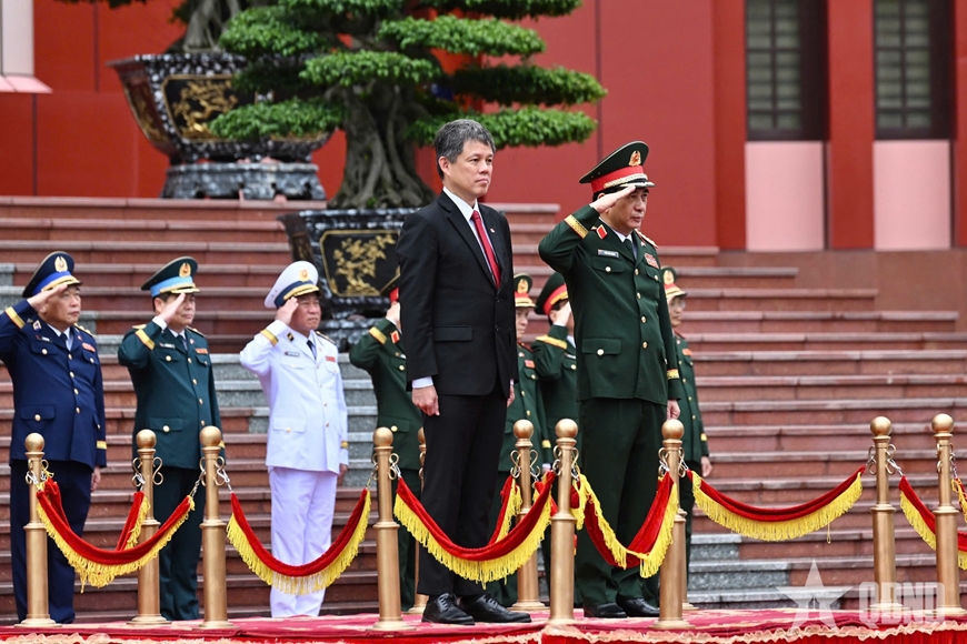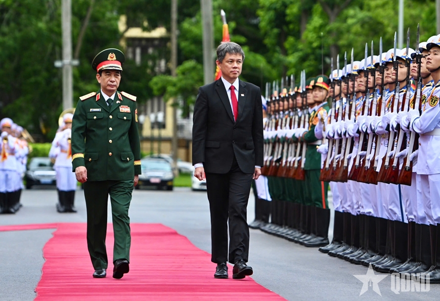 | Đại tướng Phan Văn Giang và ngài Chan Chun Sing duyệt Đội danh dự Quân đội nhân dân Việt Nam. Ảnh: VIỆT TRUNG |