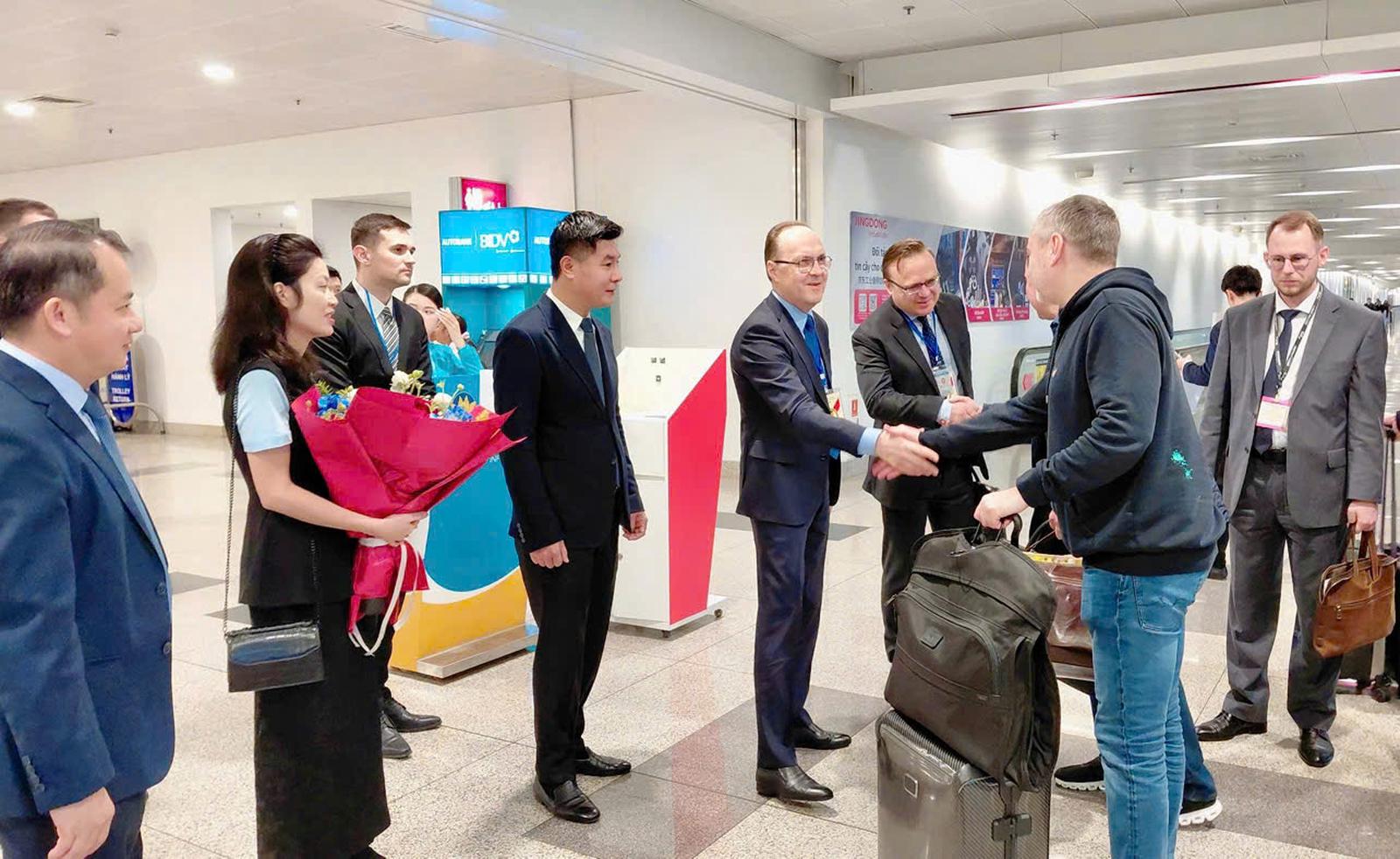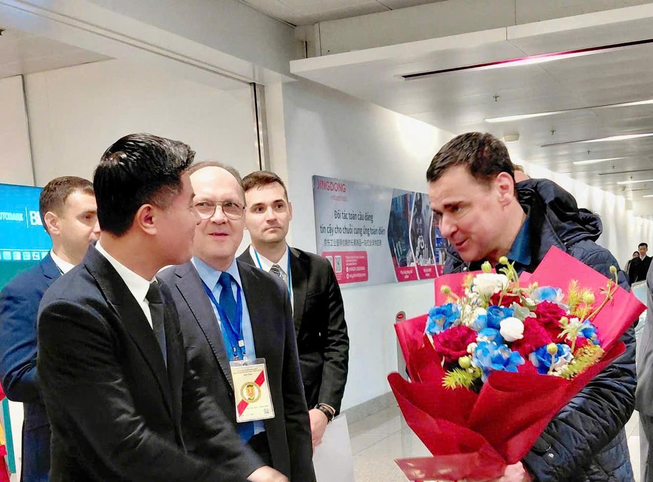 Phó Tổng Thanh tra Chính phủ Nguyễn Văn Cường chào đón và tặng hoa Trợ lý Tổng thống Nga Mironov Dmitry ngay khi chuyến bay VN62 hạ cánh lúc 6h20 tại Sân bay Quốc tế Nội Bài. Ảnh: P.A