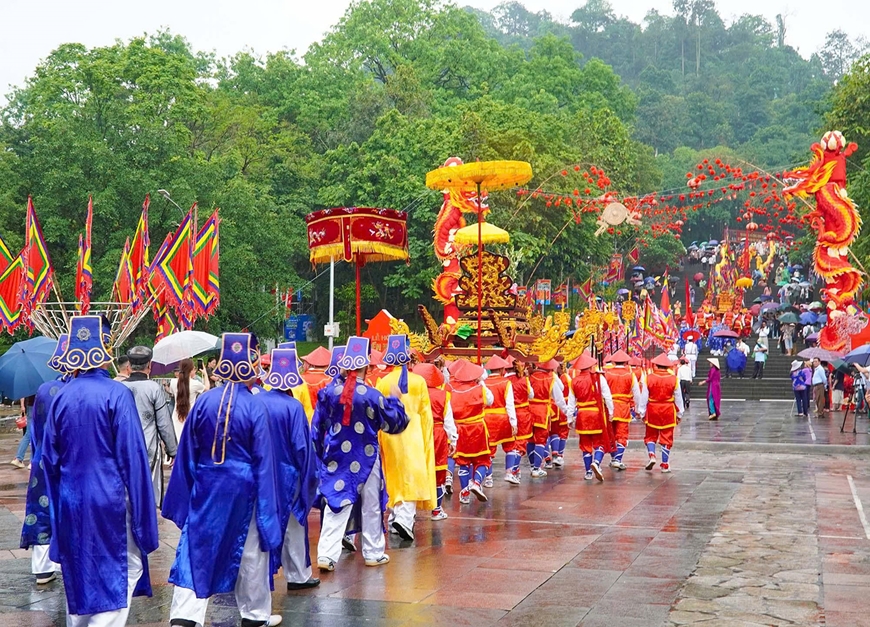 Rước kiệu về Đền Hùng là nghi thức truyền thống nhằm tri ân công đức các Vua Hùng. Ảnh: THÙY LINH