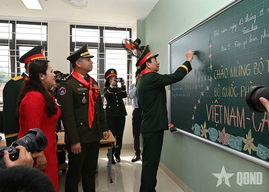 “Tôi xin chúc tất cả các em học sinh Campuchia và Việt Nam học tập tốt, thành công trong tương lai, trở thành những mầm xanh tốt cho xã hội, đất nước, gia đình và cho chính bản thân mình trong tương lai, để góp phần xây dựng đất nước ngày càng phồn vinh. Cuối cùng, tôi xin chúc Hiệu trưởng, Ban giám hiệu, các thầy, cô giáo và các em học sinh sức khỏe, may mắn, hạnh phúc và thành công trong mọi nhiệm vụ, mang lại hạnh phúc và thịnh vượng cho quân đội và nhân dân Việt Nam”, Đại tướng Tea Seiha phát biểu.