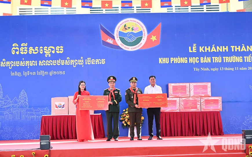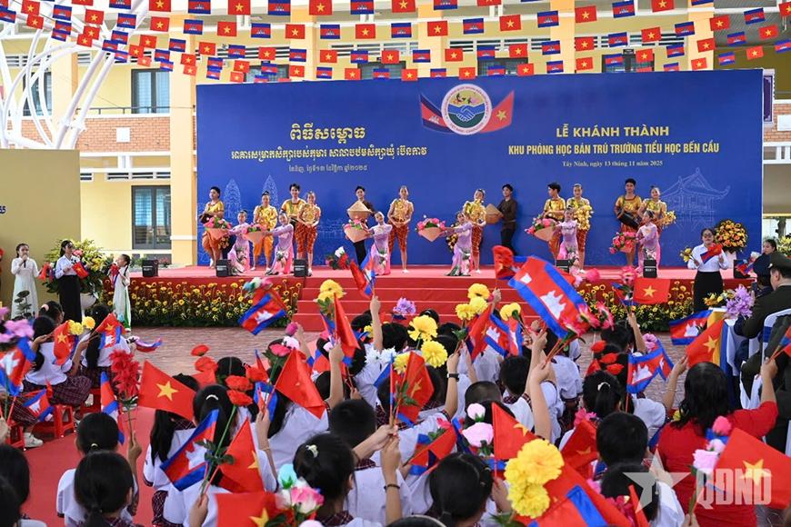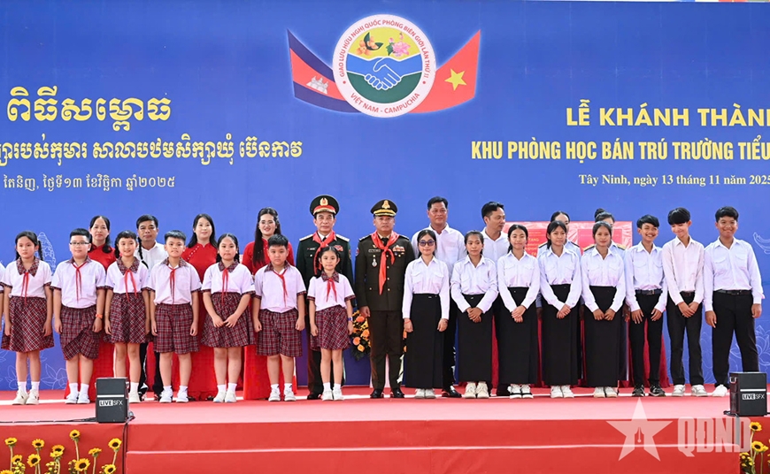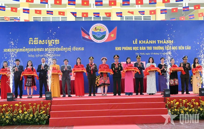 Trong khuôn khổ Giao lưu hữu nghị quốc phòng biên giới Việt Nam - Campuchia lần thứ hai, sáng 13-11, tại tỉnh Tây Ninh, đoàn đại biểu hai nước đã dự lễ khánh thành công trình khu phòng học bán trú Trường Tiểu học Bến Cầu (ấp Thuận Lâm, xã Bến Cầu).