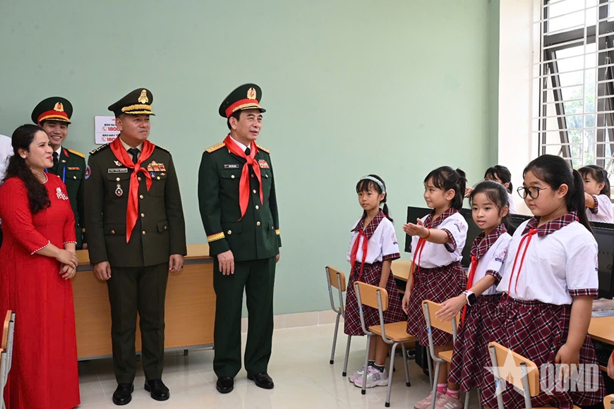 | Hai Bộ trưởng tham quan phòng học nhà trường. |