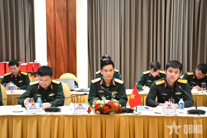 | Trung tướng Nguyễn Huy Cảnh và các thành viên đoàn Việt Nam tại hội đàm. |